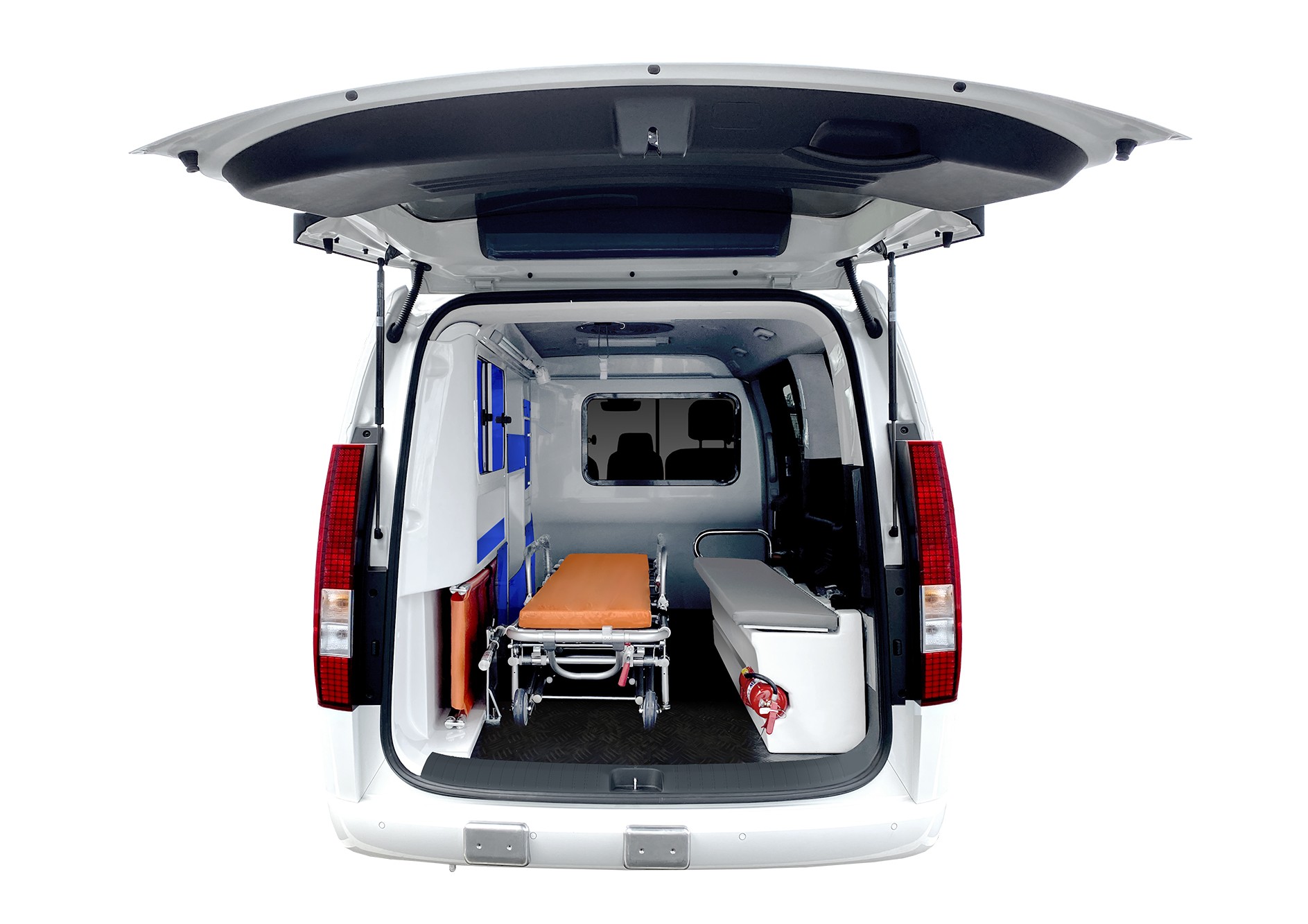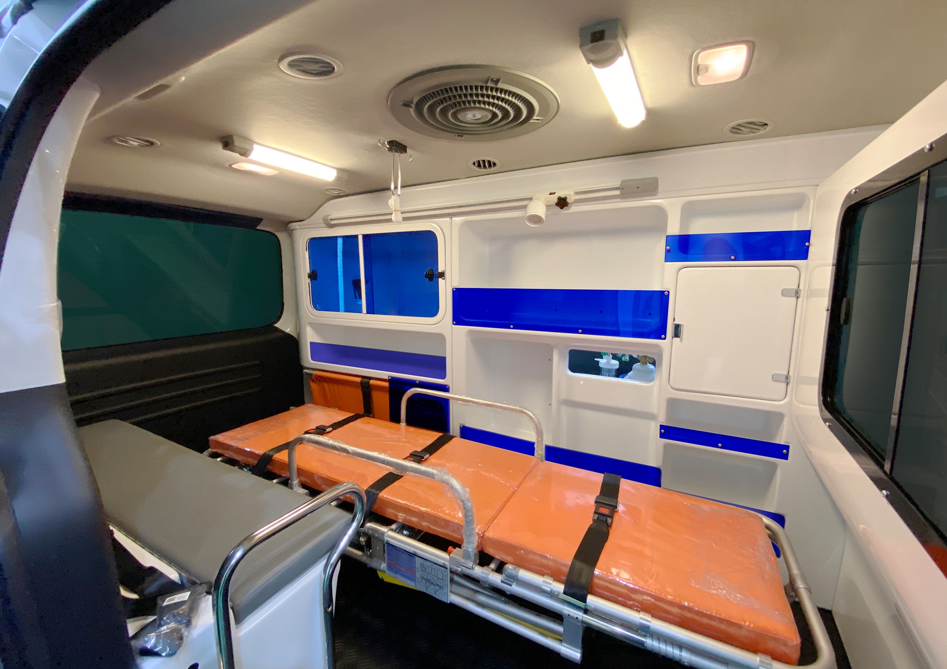 Tủ âm vách, móc treo truyền dịch, 2 bình oxy, cáng chính, cáng phụ, quạt thông gió, cổng cấp điện, đèn cứu thương, vách ngăn, loa và micro thông báo cấp cứu, bình chữa cháy.